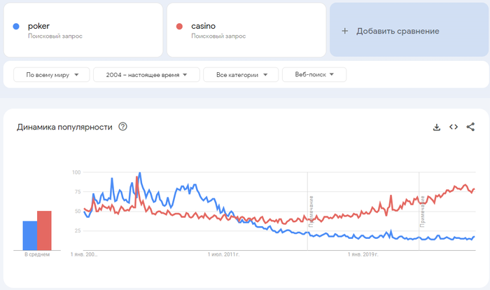 Кстати забыл вчера приложить занимательный график из Google Trends про популярность поисковых запросов. Как видим начиная с 2009 года с каждым годом покер падает всё ниже и ниже, а запрос на казино напротив, продолжает расти.