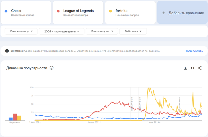 Не до конца понимаю, что ты пытаешься мне доказать. Что шахматы не теряют актуальность? Ну я считаю иначе. Шахматы проигрывают по онлайну таким играм как лига легенд, фортнайт и т.д.. И продолжат проигрывать в будущем.