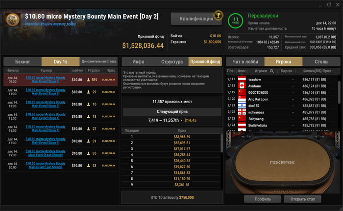 Ну и бонус, с билетов за 1 евро протащил очень серьезный стек (2 стартовых) во 2 день турнира. Обычно не играю эти билеты, но тут просто перед сном зашел под конец лейт реги и легко прошел. Не играл турниры по одному евро уже лет 5, вспомню молодость)