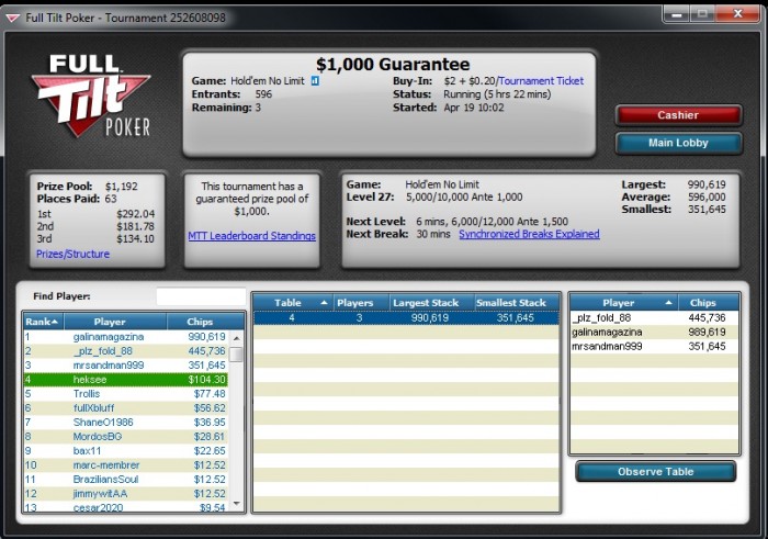 статы что-то типо 24\20 точно не помню Poker Stars, $4 Buy-in (6,000/12,000 blinds, 1,500 ante) No Limit Hold'em Tournament, 3 Players