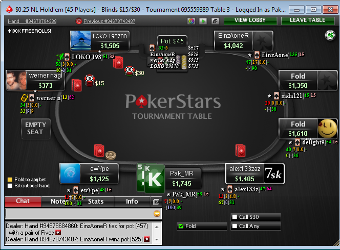 Poker Stars $0.23+$0.02 No Limit Hold'em Tournament - t10/t20 Blinds - 8 players