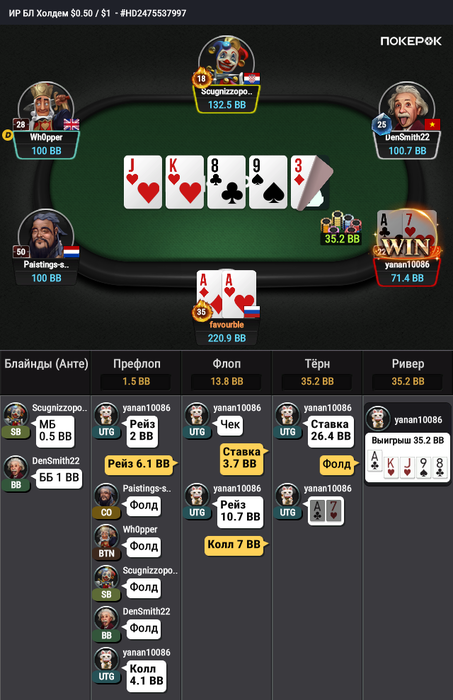 HornetMK, да нет я вполне понимаю его рендж у него стрит любой и возможно Кx,Ax превращенные в блеф. Но этого недостаточно для плюсового кола.