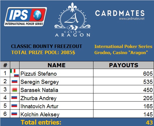 Пока игроки разбрелись по компаниям и отдыхают возле барных стоек казино "Aragon" (а кто-то уже ушёл дымить в наш шатёр), в игровом зале до сих пор решается судьба билета на турнир IPS High Roller Event. В сателлите осталось 4 человека, из которых один уйдёт с билетом, а раннер-ап станет счастливым обладателем $300.