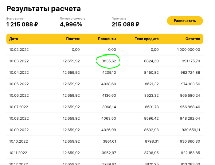 OGamee @ 10.02.22Нас это не устроило, так как я все посчитал и знал что переплата просто огромная даже под такой маленький процент, и даже когда ты гасишь досрочно все равно в ежемесячный платеж включена переплата по процентам за все года, и первые наверно 10 лет основного долга гасится 20% остальное проценты, если брать на 15 ситуация совсем другая в нашу пользу.