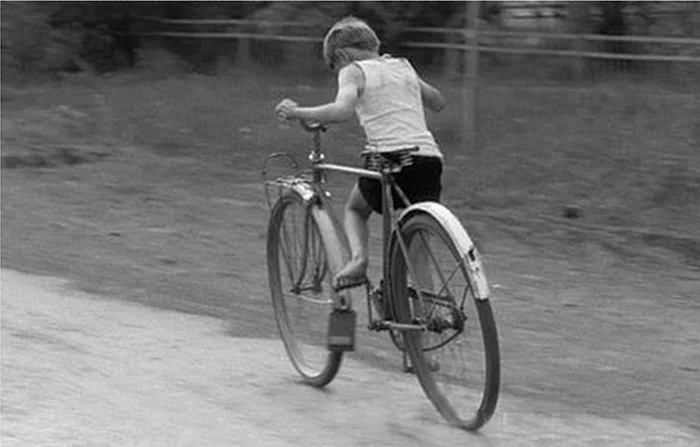 Как сейчас помню, 1 мая, нам с двоюродным братом по 6 лет, мы в деревне у дядьки берём из сарая вот такой велик, и под рамкой катаемся на нем с большой горы, вернее пробуем нажимая на тормоз педалями, спускаться с горы. У меня отказывают тормоза, я падаю, меня великом накрывает, я ору, прибегает тётка с братом, у меня на локте на левом сильная опухоль.