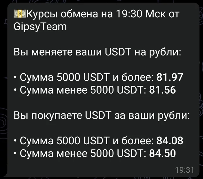 Актуальный курс на продажу меньше 5к USDT = 81.56р. За он-лайн перевод как правило менялы дадут еще меньше из за рисков блокировок. Выходит, справедливый курс на сегодня примерно 81р за 1 USDT. Все что выше, риски возрастают многократно. Особенн, вот эти объявы выше офф курса на несколько рублей (85р+).