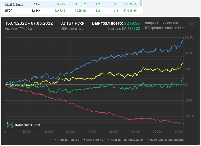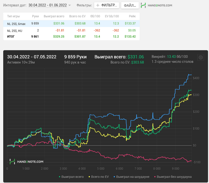 Итого: около 170часов игры и часов 25 +- теории , почти 200 часов покера , и + 1,3к профита ( по ЕВ +1,8к обида ебаная )