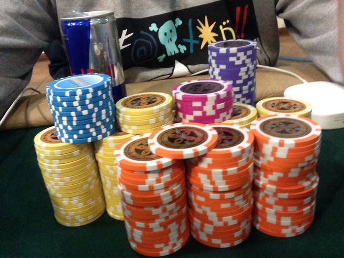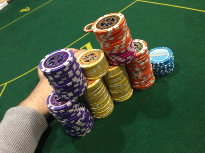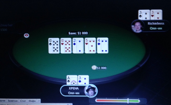 Первая раздача после перерыва, 4к-8к блайнды, я с утг 17к с большой стек рейз 40к, поговорил с ним, по разговорам похоже на АК. Подколили, флоп чек колл ставки 50к, терн мы 125к и колл алл ина, там