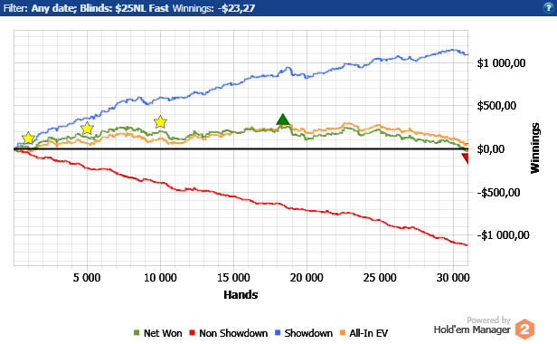 Отыграл сессию, очень паршиво что по результатам, что по качеству игры. Посмотрел крупные банки - примерно 130$ слито в идиотских коллах/рейзах/пушах. Напрочь не понимаю, как играть в 3бет потах, основные заливы в них. На нл10 это не было так ощутимо, т.к. игра не такая агрессивная, а вот на нл25 меня очень сильно наказывают. Аналогичная ситуация с 4бет потами, которых на нл10 практически нет, потому что в 90% случаев против 4бета играют либо пуш, либо фолд. Как в них играть - тоже не понимаю, что рейзером, что коллером, т.к. диапазоны в них зачастую сложно предугадать. И самое неприятное - пока не представляю, где почерпнуть инфу по этим вопросам.