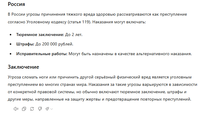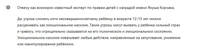 Ты уверен в этом? Даже если есть доказательства? я скидывал не статью, а скрин из chatgpt. В любой адекватной стране за угрозы физической расправы есть статья и срок. А заниматься таким будучи взрослым против несовершеннолетних это нужно быть либо полным дебилом и конченым, либо насильником со стажем.