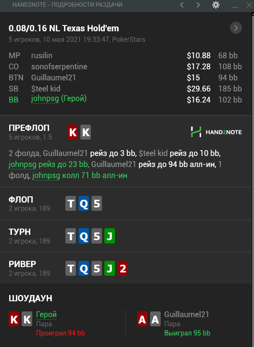 Даже не смотря на мой опен 4бет и 5бет пуш я не в силах бросать тут КК)) колл со словами сука ну тузы, но выкинуть не смог))