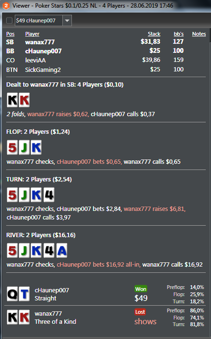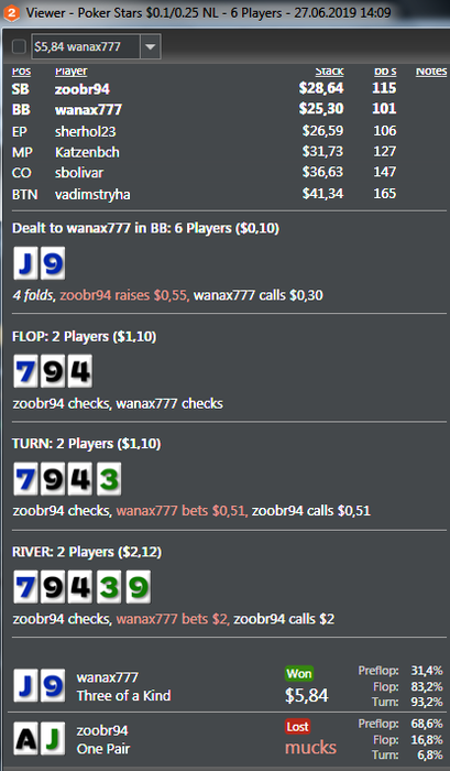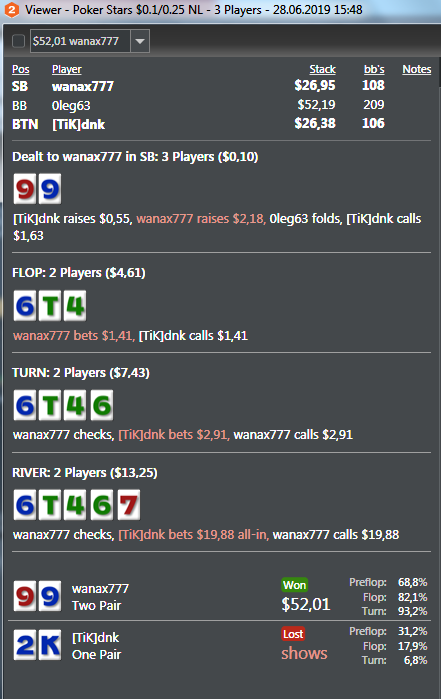 Я с тобой не согласен, даже на нл25 по такой линии, у хорошего рега против рега, примерно 1 раз из 5-ти, тут будет воздух по такой линии, а уж про велью бетинг самого себя, я уже и вообще молчу(JJ/KJ/55/44/AJ/A4/A5), другое дело фишы ниты у которых яйца размером с зелёный горошек, они то как раз таки либо способны с 100% частотой, либо вообще не способны. Я очень много работал с базой топ рега нл25 перед стартом и достаточно хорошо знаю на что способны хорошие игроки, по этому я однозначно не согласен с вами ребята. И да, я не оправдываю свои действия, мне наоборот важно узнать множество различных точек зрения. Но в данной раздаче, ошибка в гейском сайзинге чек-рейза терна, с колом ривера тут никак не отскочить. Даже не хочу просить товарища, чтобы в солвере раздачу разобрал, так как знаю, что тут 99,99% кол ривер.