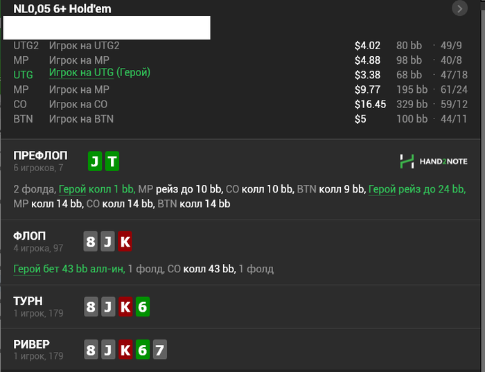 OrisLumenis, в защиту этого фиша, которого я считаю регом. Как я понимаю, вероятность попасть в трипс с флопа меньше чем вероятность попасть в сэт, ну возьмём, что процентов 14. Он знает, что я спокойно могу протащить 2 - 3 бареля в блеф. Соответственно при попадании в этот трипс, он всяко получит проплату. В итоге колить 9ББ, чтобы выиграть 250ББ, но 250ББ мы будем выигрывать, допустим только в 70% случаев, если трипс придёт, то получается 175ББ. 9 делим на 175ББ, получаем 0,05. А значит шансы банка с предполагаемыми дают этому игроку 5%, хотя у него их 15%. Ну вот и скажите миносово ли он сыграл в этой раздаче?? С К8??