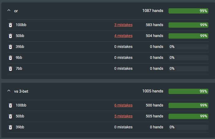 2) Выучить наизусть и тренировать UTG и UTG+1 в глубине 100-50, 50-40, 40-30, 30-20, 10 и 7 бб.