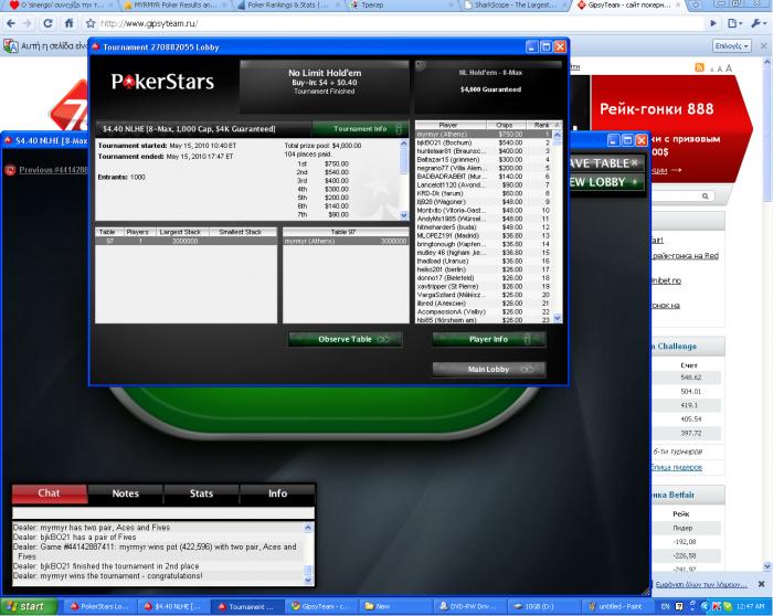 Вчера создал блог , сегодня уже небольшой успех: https://forum.gipsyteam.ru/index.php?viewtopic=6571 Вылетел в топ3 за 109$ ФТ 23500$(281 человек) гаррант , поле было довольно слабое поэтому с топ 36-40 играл в агрессивном стиле , когда началась предфиналка статы были 35 на 33 и трибет 15 на 100 рук. Когда закончилась предфиналка у меня был чиплидерский двойной стек и статы 41 на 39 трибет 22 на 70 рук вроде бы. На финалку вышло половина коротышек , по большей части из-за людей на моём столе , но за столом оказалось 2 фиша бигстека , которые вытворяли то , что обычно вытворяют фиши, один из них убил 3-4-ёх коротких.Тут то карту и отрубило и я мотался в районе 120-200к. Топ4 получился очень муторный.Один из фишей постоянно по дебильному удваивал рега, что не сильно мешало, но мешало. Как только один фиш зарейзил А2 , а другой защитил на Q2 вышел борд Q 9 3 и фиш с Q2 сыграл донк-колл и выиграл. Через несколько раздач я вылетел KJs<AJo со стеом 7м, против фиша, у которого был опенстилл 100% в меня. Выигрыш:3500$. Так же продаю доли на мэйн РПС Киев осталось 26%: https://forum.gipsyteam.ru/index.php?viewtopic=6383&st=0#entry172110