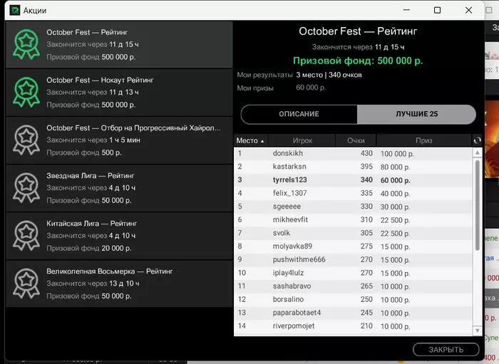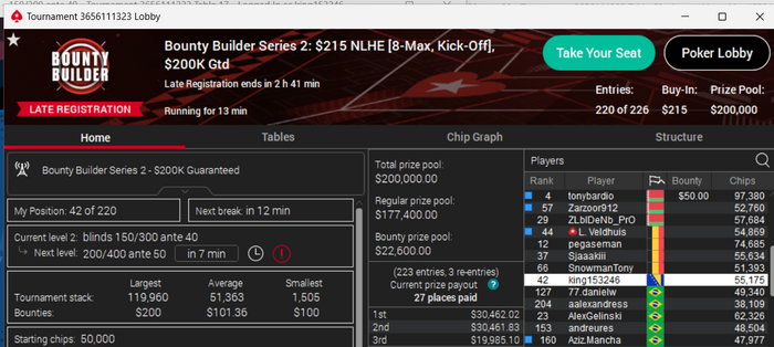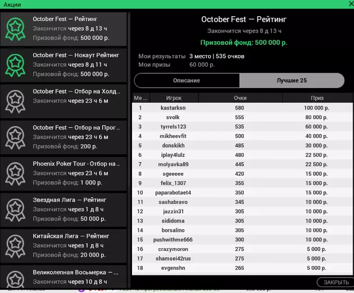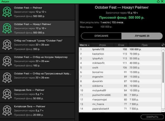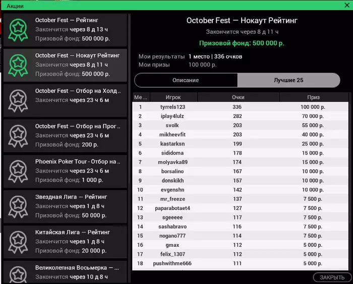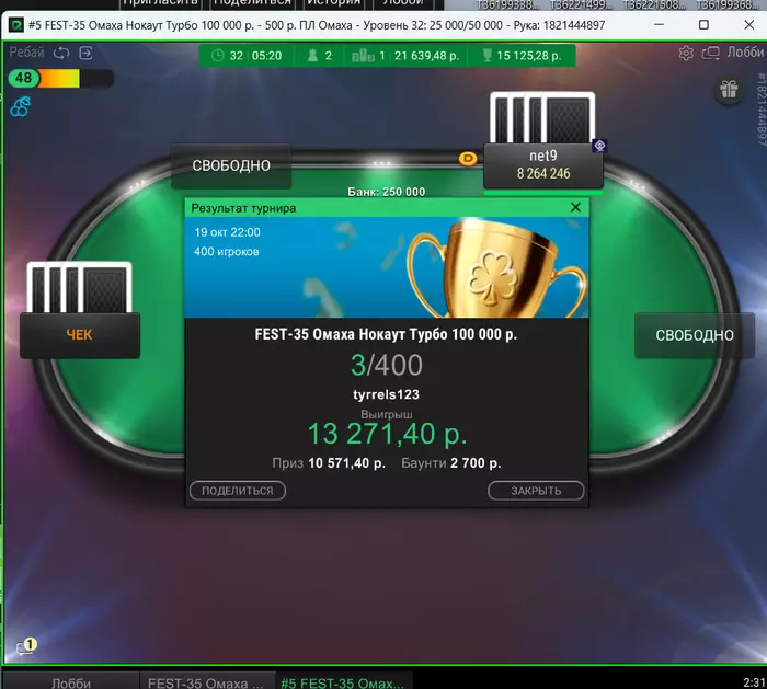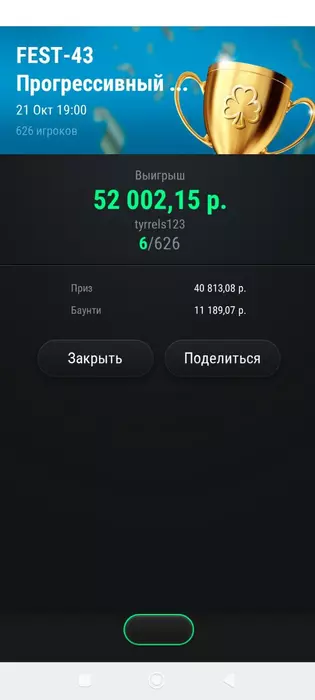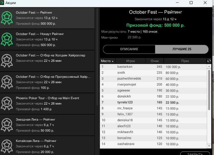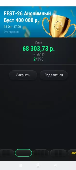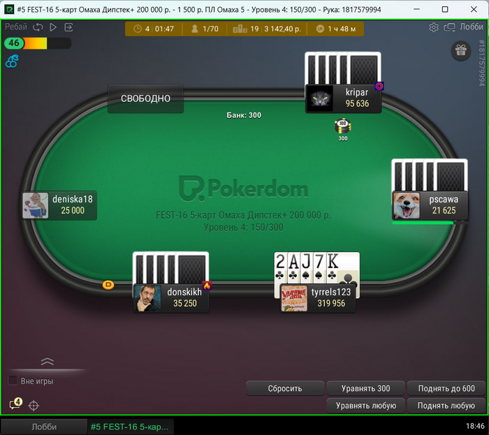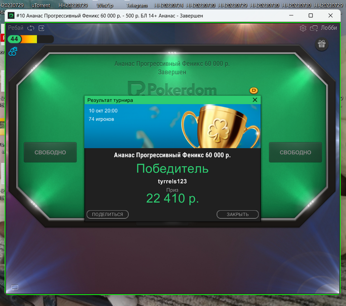 Сегодня такие. На покердоме случился довольно неприятный баг. Так как турнир был в формате зум, то с 12 человек формат менялся на стандартный. И вот меня просто не посадило за новый стол, на вторую минуту я понял что что-то в "в ожидании других игроков" не чисто. Начал пытаться войти за стол через лобби турнира, но выдавало ошибку. Пришлось спешно заходить с мобильного жены(свой последний раз заряжал больше года назад), там турнир открылся, и так как у меня был короткий стек съело почти четверть фишек.