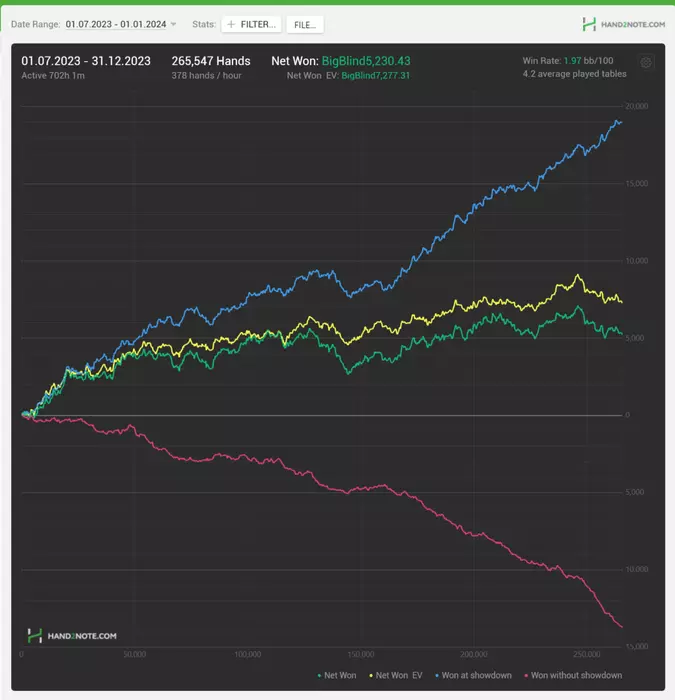 Много времени ушло, чтобы начать наживать на нл200, но вроде последнее время стало получаться (последние 80к рук на графике):
