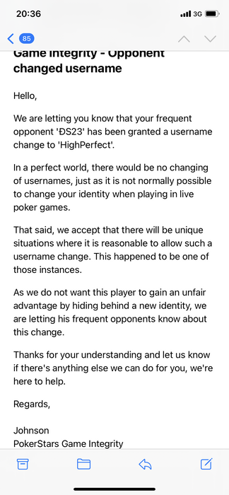 Довожу до сведения общественность, что со всеми тремя скриннеймами я наиграл дистанцию от 2к рук. Изменение скриннейма ÐS23 -> HighPerfect доведено до меня письмом gameintegrity. Изменение скриннейма FlopIsPrfect -> ÐS23 не доведено до меня никак. Насколько мне известно, старзы в исключительных случаях дают менять скриннейм (в случае, если в нем засвечены какие-то личные данные, насколько я понимаю). Об изменении скриннейма больше одного раза я слышу впервые, причем оба эти изменения должны были донесены до меня старзами (по факту одно было, а другое нет). Из этого мой логичный вывод только один: ÐS23 и HighPerfect один и тот же акк с измененным скриннеймом, FlopIsPrfect мультиакк, получивший надо мной эдж на "замаливании стат".