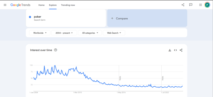 для меня этот график наоборот признак того, что покер - живее всех живых: ведь несмотря на то, что он давно не находился в трендах, в онлайн катке по прежнему достаточное количество любителей, чтобы можно было уверенно профитить за столами и иметь гринд в качестве основного источника дохода.
