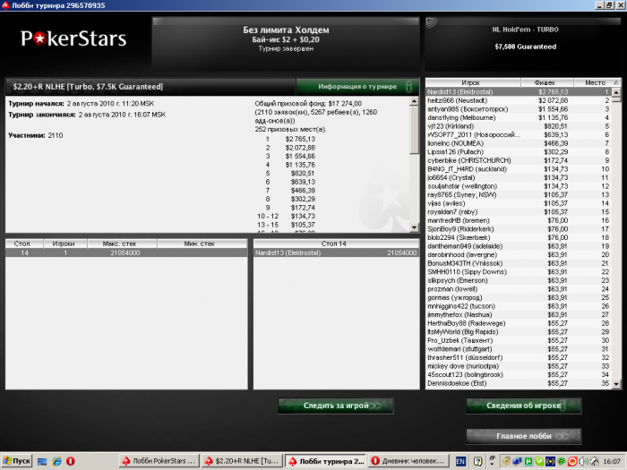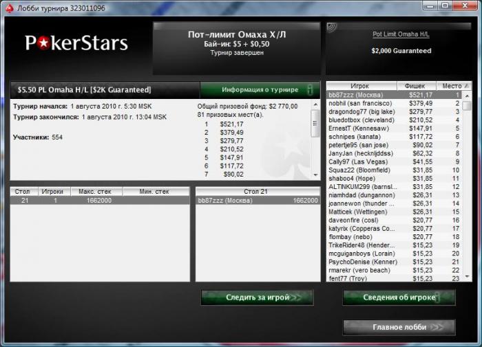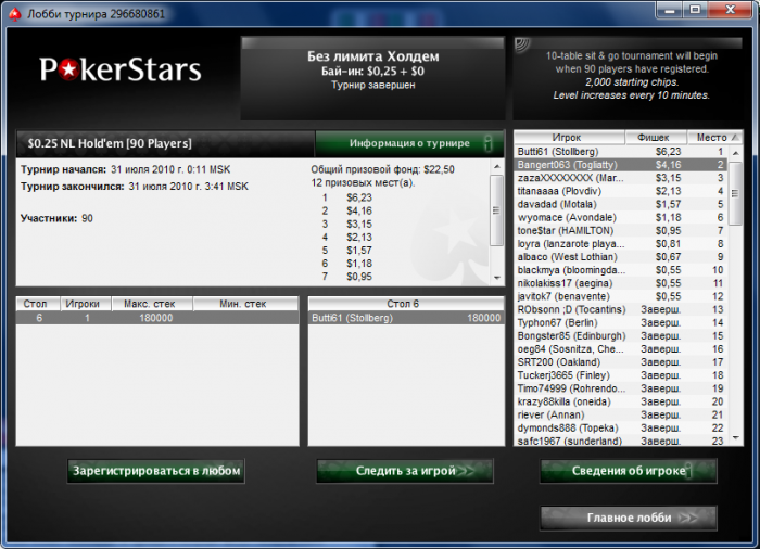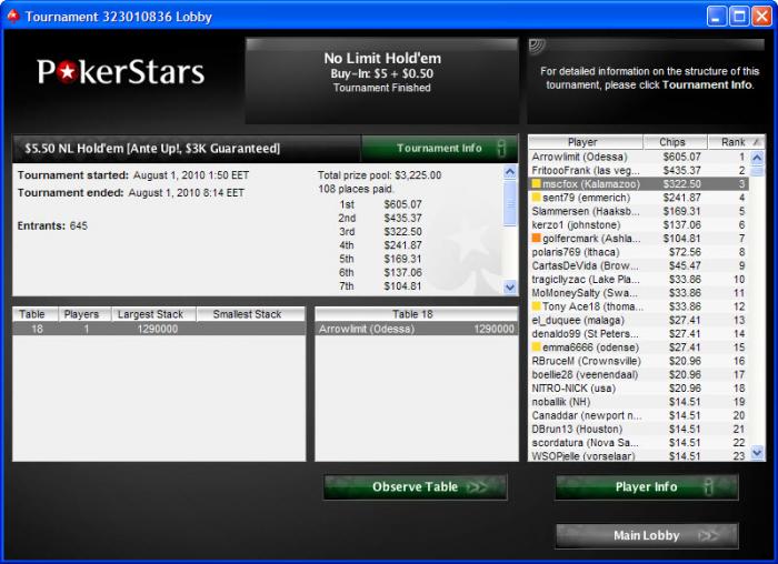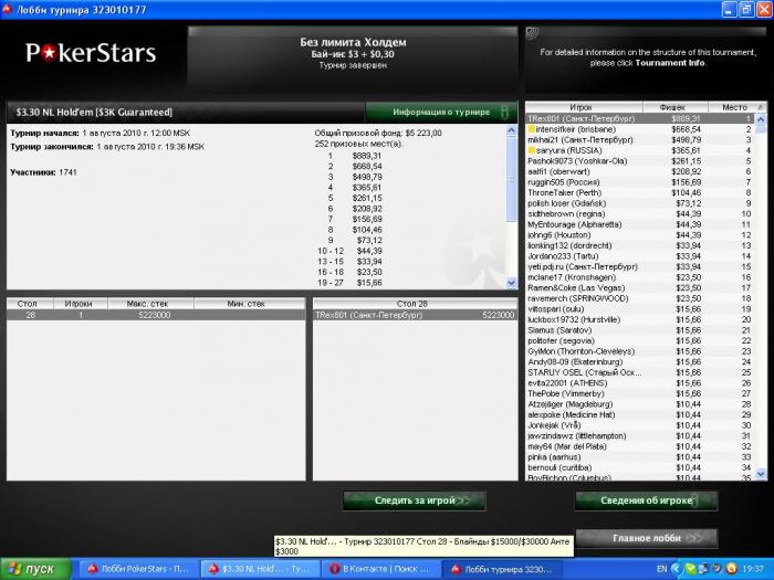 PokerStars Турнир №323010267, Безлимитный Холдем Бай-ин: $10.00/$1.00 USD 1418 игроков(а) Общий призовой фонд: $42910.00 USD Турнир начался 01.08.2010 16:00:00 MSK [01.08.2010 8:00:00 ВВ]