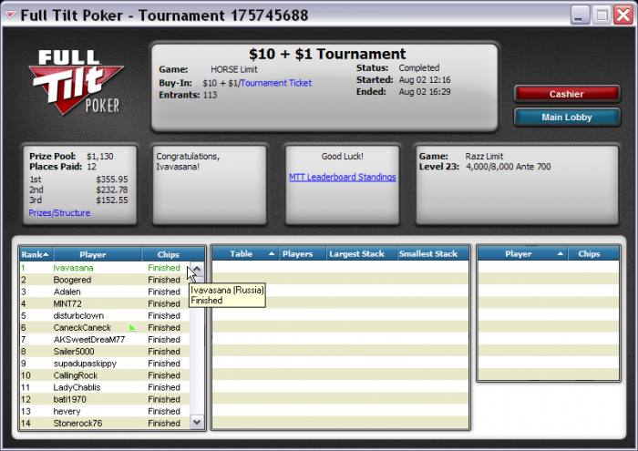 Сейчас усиленно готовлюсь к серии ФТОПС по лимитным играм. 6-го предстоит играть ХОРСЕ 533$, ради этого я даже кэш запустил. Сегодняшняя подготовка прошла на УРА! Деньги не большие, но достижения достойные в лимитки: 1е место в ХОРСЕ 11$ (113 участников), 1е место в Стад8 26$ сат, 2е место в разз 75$ сат и 2е место в стад 26$ сат.