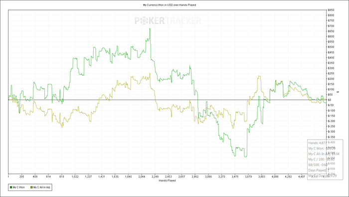 21. И вот тут накосячил. Против рега, оупен у него накафтофе 35, фолд на 3бет 20, на кбет 53, рейз 29. Надо было пушить.