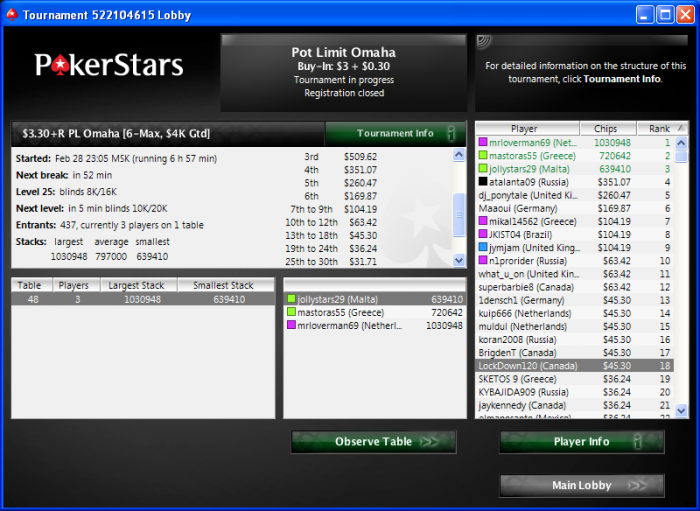 Poker Stars $3.00+$0.30 Pot Limit Omaha Hi Tournament - t125/t250 Blinds - 6 players -