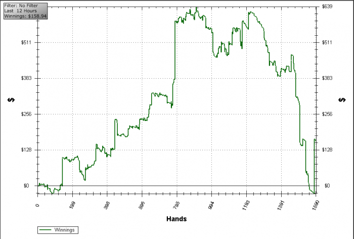 Часа два играл один стол нл 200, паралельно почитывая форумы. Хотел уходить, но такой фиш сидел, что я бы с ним один стол сутками играл)) 80-50, трибет 20. Фолд на трибет 0 из 30 раз. Казалось бы что может быть проще - сиди и наживай. А хрен там. Ни у одного рега не получилось уползти в плюсе. Просто у фиша была небольшая особенность - выигрыш на шоудауне 70%. В итоге он остался с восьмерным стеком, а разлучил нас перезапуск сервера.