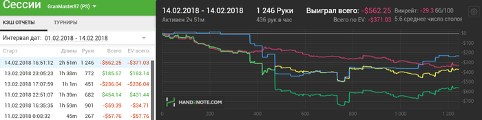 Печальные итоги февраля: Что ж, в этом месяце не везло да, играл вроде более менее, просто не заходило. Возможно просто до этого был апстрик в 250к рук, но не очень вероятно. Интересно, что принесет первый месяц весны. Стараюсь много играть по времени, но игра есть далеко не всегда, а подключать доп. рум уже не особо позволяет БР. Причем еще март будет основным и последним по капиталовложениям в ремонт, после него будет ясна финансовая ситуация в нашей семье, там и посмотрю насчет мультируминга. А пока посвящаю остальные рабочие часы теории, так что доволен рабочим временем.