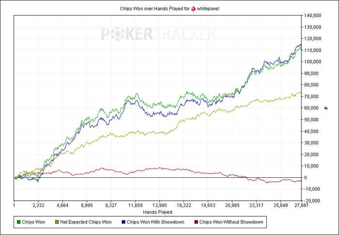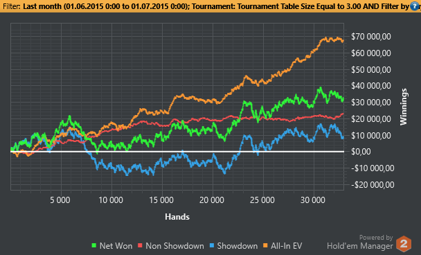 На 30 продолжает апать, мне реально хорошо сдают, плюс походу перебрал по множителям, особенно это заметно на контрасте с последними неделями на 15, так непривычно попадать во флопы и тащить коины) В связи с этим и с тем, что ев фишки/турн далеко не предел мечтаний, немного сыкотно, что вот-вот откатит и начнется жопа, ну ладно, будем решать проблемы по мере поступления, пока все четко)