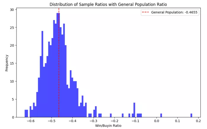 Ну давай возьмем что-то среднее, вот я взял огромнейшую выборку определенных фишей примерно одинакового впип с разной агрой и общим рои -46%, а потом 500 раз рандомно выбрал из них по 10к входов, чтобы примерно понять разброс по РОИ.