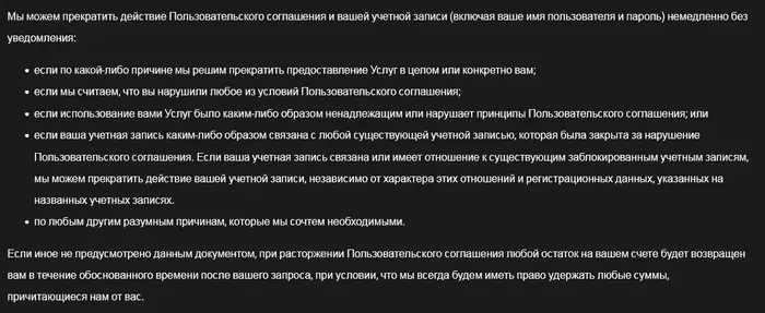 Я не юрист, но, на мой взгляд, пока есть вот это(скрин ниже) все разговоры о ToS ни о чем, потому что там где допускаются формулировки МЫ РЕШИМ и МЫ СОЧТЕМ не требуется доказательств и получается что все остальное рассказывает только о вероятностях БАНА, но не исключают его. Поэтому я и написал что Покерок признал фонды запрещенными организациями, а соответственно и всех причастных к ним. Другими словами ОНИ РЕШИЛИ, о чем Иван здесь и объявил публично. Произвол? На мой взгляд Да. Подписались? Да. Получается надо бороться сначала с тем чтобы убрали эти пункты, а уже потом писать о размытых формулировках и других проблемах ToS. Иначе какой смысл то?
