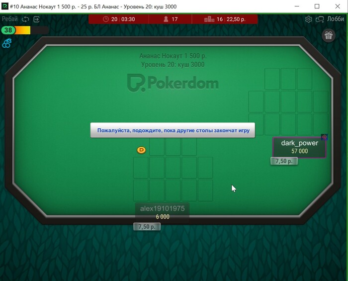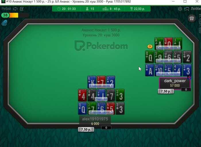Когда вы публикуете скрин, то желательно описать ситуацию подробно. Формулировка "В прямом эфире цирк на PD." выглядит туманной. При посредничестве Vidnovchanin стало понятно, что игрок находит оппонента в ситауте (или специально использует твинка) и тянет с ним время, чтобы досидеть до ИТМ. Передам его в СБ. Тем более на прошлом вашем скрине он же прошел до второго места через такой же трюк.