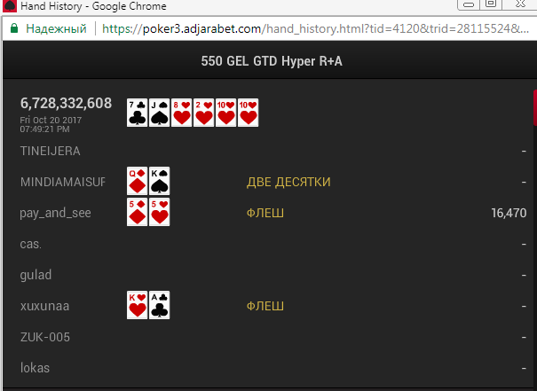 Как то играл,под коньячок, фо фан. Раздали,все All In,фишки пошли ко мне - у меня был флеш.Но,что то меня смутило,т.к. у другого игрока был флеш по старше. Смотрю повтор,а там "картина маслом" ... Глюкнуло конкретно,но выигрыш честно пошел ко мне