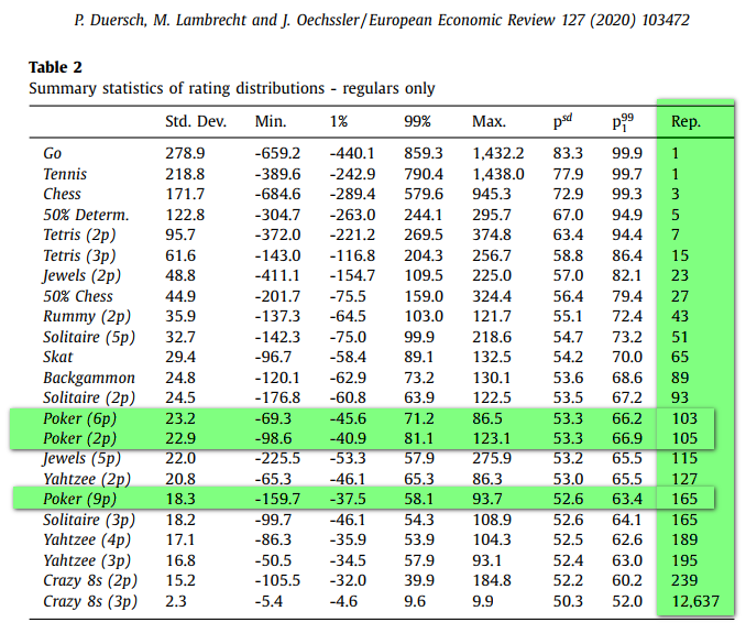 Ты прав, покер - это по определению игра с неполной информацией, тогда как шахматы - это совсем другая игра. Однако методика, которую используют авторы, хороша тем, что позволяет сравнивать игры в целом, независимо от таких нюансов. То есть они смотрят на игры, выйдя за рамки самих правил игр. Они используют систему Elo (The rating of chessplayers, past and present AE Elo - 1978 - Arco Pub.), которая традиционно используется в шахматах и других соревнованиях (Го, настольный теннис, скрабл и др.). Её преимущество заключается в том, что рейтинги игроков корректируются не только в зависимости от самого исхода, но и от силы их противников. Рейтинговая система применима сразу к играм для двух игроков и может быть обобщена для обработки многопользовательских соревнований. Кроме того, авторы калибруют рейтинговую систему Эло, чтобы добиться наилучшего соответствия для каждой игры и типа соревнования в отдельности.