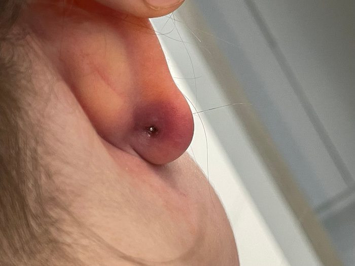Так выглядит серёжка. Вот та задняя часть - стопор, которая насаживается на стержень - была полностью в ухе. Выглядело это так (внимание, не самая приятная фотка, впечатлительным не смотреть!):