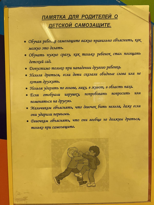 Памятка для родителей, которую вывесила "психолог" в нашем саду. Меня чет вывернуло от этих формулировок, особенно от того, что оказывается детский сад - это что-то вроде школы боевых искусств. Я, конечно, поговорил с воспитками, они сняли, но осадок остался...