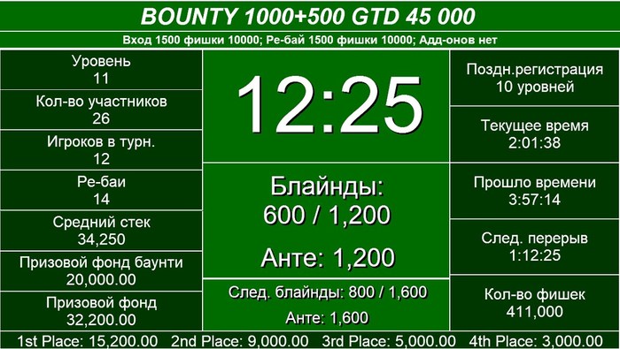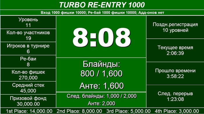 Закончился турнир TURBO DEEP STACK 5.000 GTD 120.000 6 Микава Джумбер: 17.000 5 Улюбеков Мурат: 19.000 4 Чеботарь Антон: 24.000