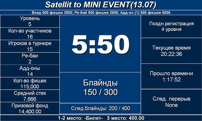 Расписание на пятницу 13 июля. 16:00 Сателлит на Mini Event (R/A) по 500, гарантия 2 билета 18:00 Сателлит на Mini Event (Re-entry) по 1000, гарантия 2 билета 21:00 MINI EVENT по 7000, стек 25000, 12 уровней поздней регистрации по 25 минут. Гарантия 300 000!