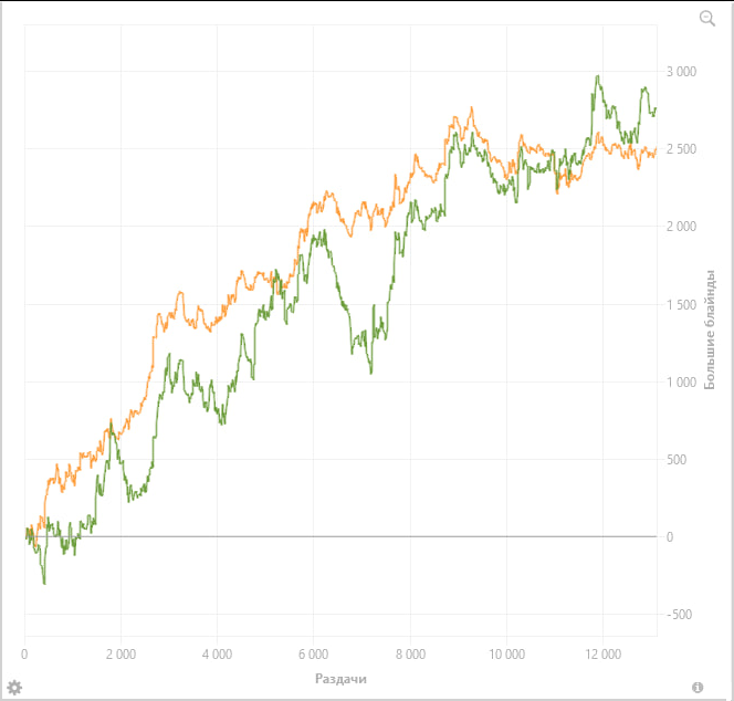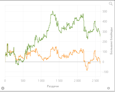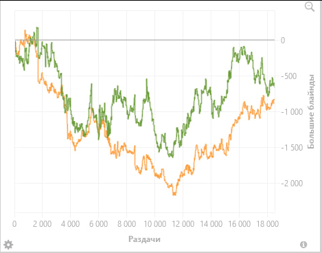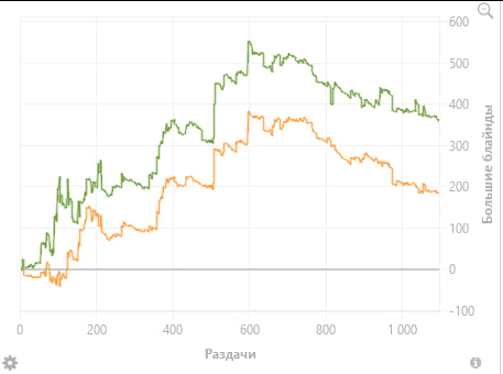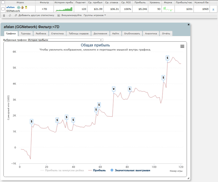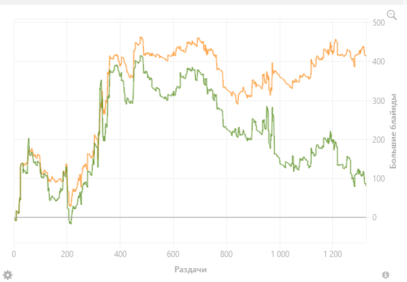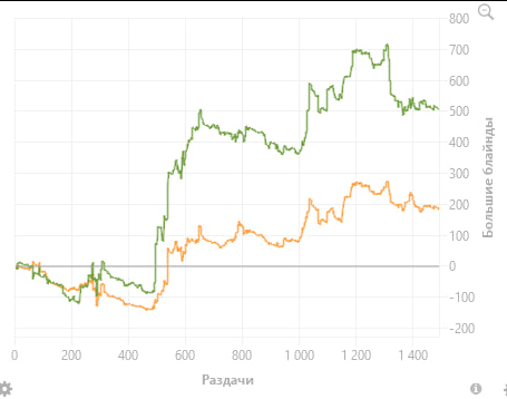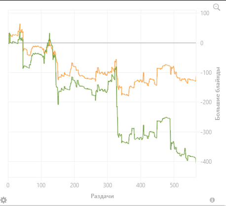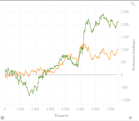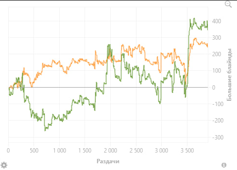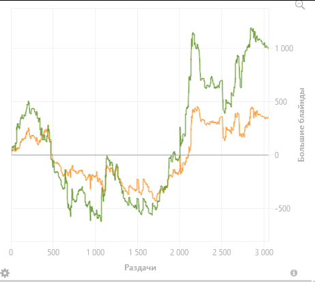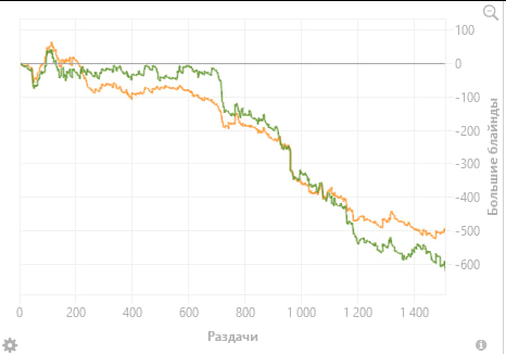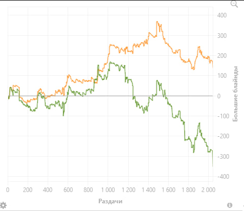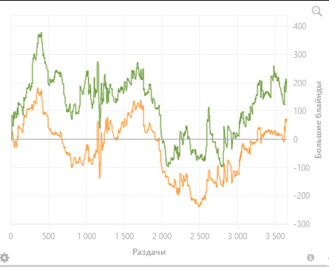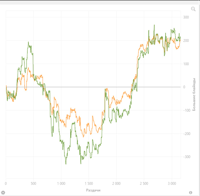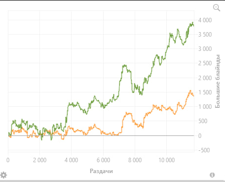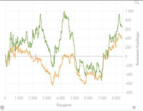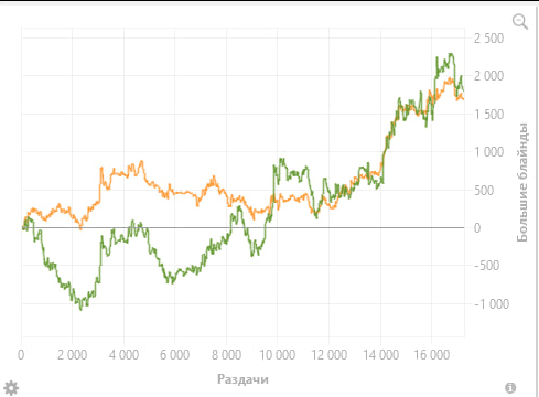 Ну правда, 4000бб фактом при 1500бб мат.ожидания - это дикий переап, не скрою, но вот эта неделя росчерком пера перечеркнула минус (и даунстрик по блайндам) предыдущих 5-ти недель, просто как пружина разжалась.