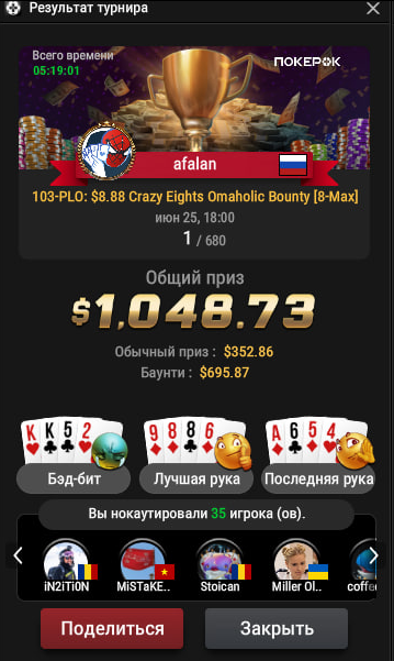 30июня-6июля. Как и ожидалось, с некоторыми изменениями, что я внес в игру (в связи с пересчетом математики баунти), я эту неделю уж точно покажу плюс, но даже я сам не ожидал насколько мне в этот раз закроет. Выбивал из турниров всё, что движется, а что не выбивалось, как говорится, двигал и выбивал.