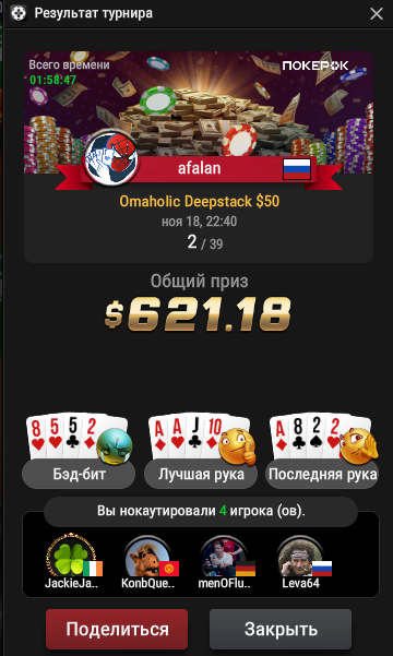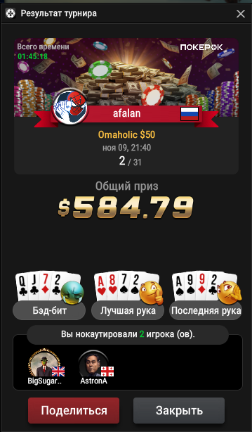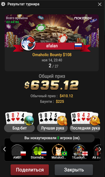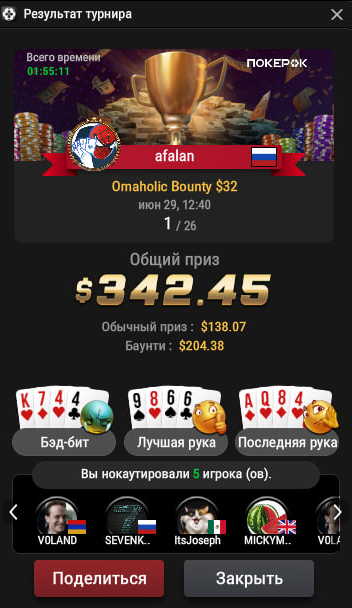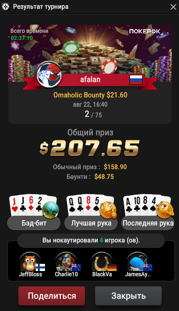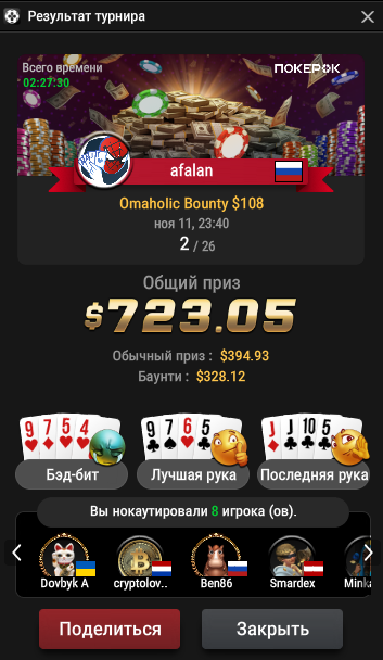 В турнире за 150$ со второго входа удалось очень хорошо раскрутиться, где выбивал всех подряд (а это турнир с увеличенными баунти), и занял в нем второе место, сыграв в хэдз-апе 1 раздачу, в монетку проиграл 100бб за 4к$, жаль с одной стороны, с другой - по монеткам никаких вопросов к Покерку. Да и в другие дни - там чутка, здесь чутка, так и сформировалась касса, вышел солидный плюс.