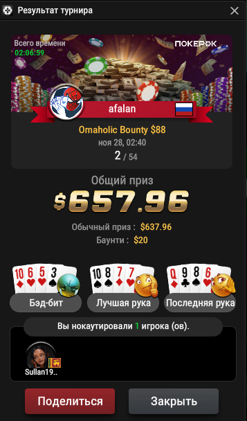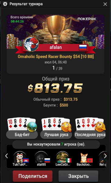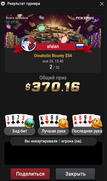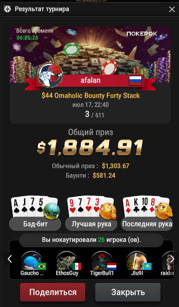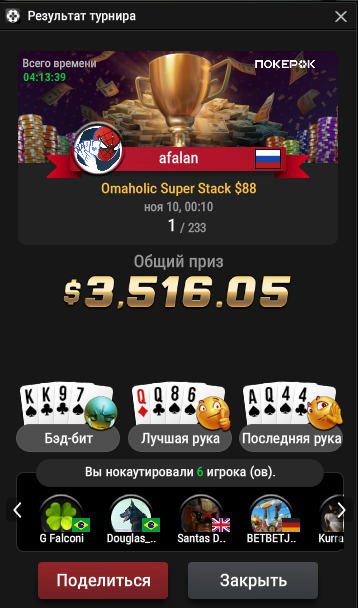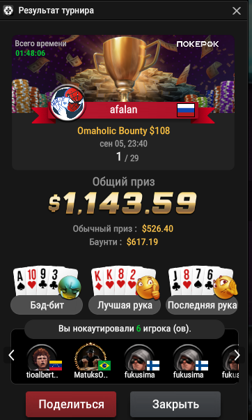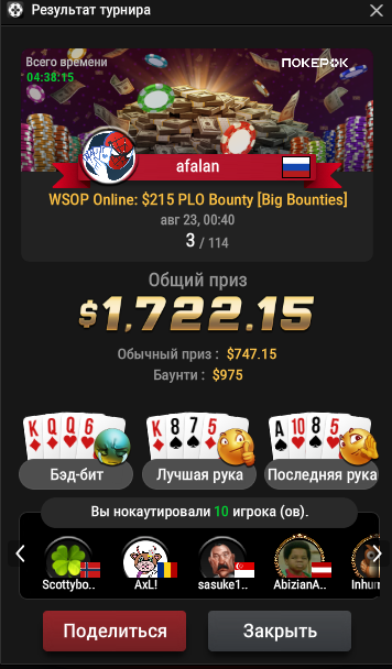 Тем не менее именно в этом турнире складывалось невероятно хорошо, сначала я учетверился с KQJ4ds, а потом нарастил стек при довольно слабом отыгрыше оппонентов. У регов в решениях тоже чувствовались эмоции и получалось ловить прибыльные ситуации, в общем в моменте я открыл 4 сундука (2*790$ и околостартовые) и был чиплидером. Ну а дальше произошло то, о чем вы уже знаете, пятый сундук все-таки оказался золотой, с суммой, пока недостаточно понятой моим мировоззрением.