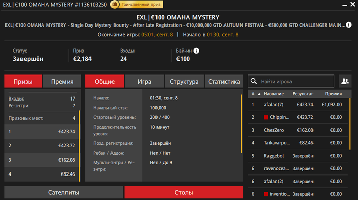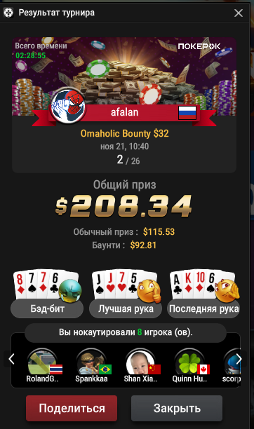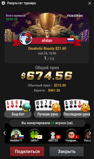 В лидерборде Омахолик занял 13 мсето, 2-й среди игроков с российским флагом, на 10-м закончил Sb_bill. АБИ резко повышать не планирую, буду более спокоен с тратой патронов на хорошие турниры и также жестко консервативен с БРМ (спасибо, госпожа дисперсия, сегодня мы квиты, но уроки прошлых лет усвоены).