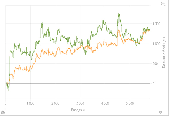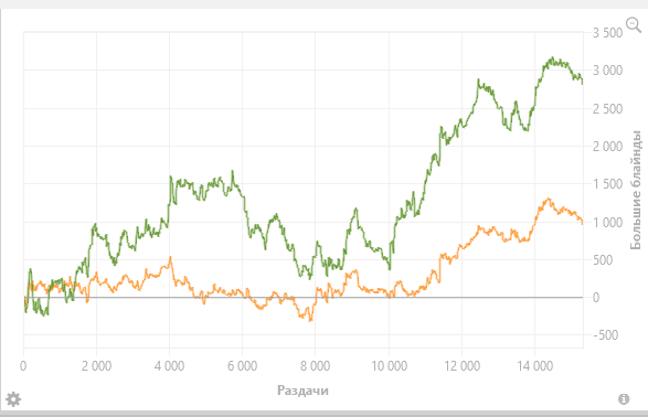 В начале второй недели сделал основной фокус на проработку допущенных ошибок и сделал частичный откат к тому, что было в рамках этого гожа (а февраль-май я имел отличную форму) и это сработало, частично перекрыв минус, который вышел в рамках моей плохой игры. Думаю, на графике видно, что играли как будто два разных человека.