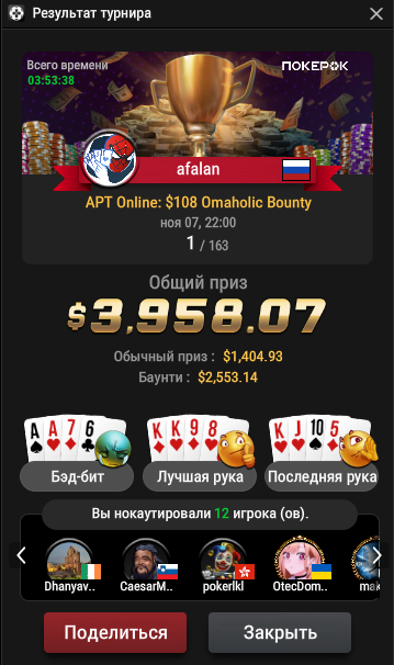 Сейчас же идет очень неплохо по моим внутренним метрикам, и даже очень сложное воскресенье с недобором 1200бб в моменте удалось вывести в плюс, разделив первое место в Sunday 88$ с G Falconi, а также взять и на этой неделе топ-1 в APT 108$ турнире.