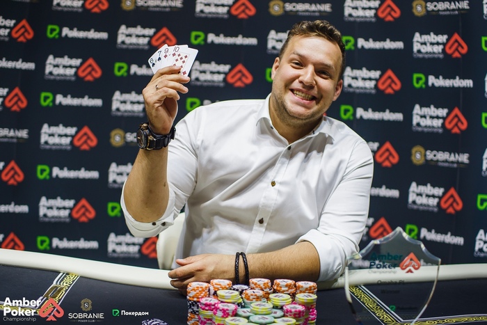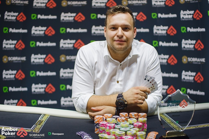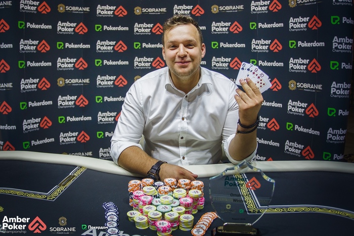 Громышков открыл в середине и получил три колла: BTN, SB и BB. На флопе игрок с большого блайнда поставил 7,600, Громышков заплатил и по тёрну заколлировал олл-ин 12,100. У Александра , у его оппонента только пара пятёрок . Ривер . У Громышкова стало 125,000.