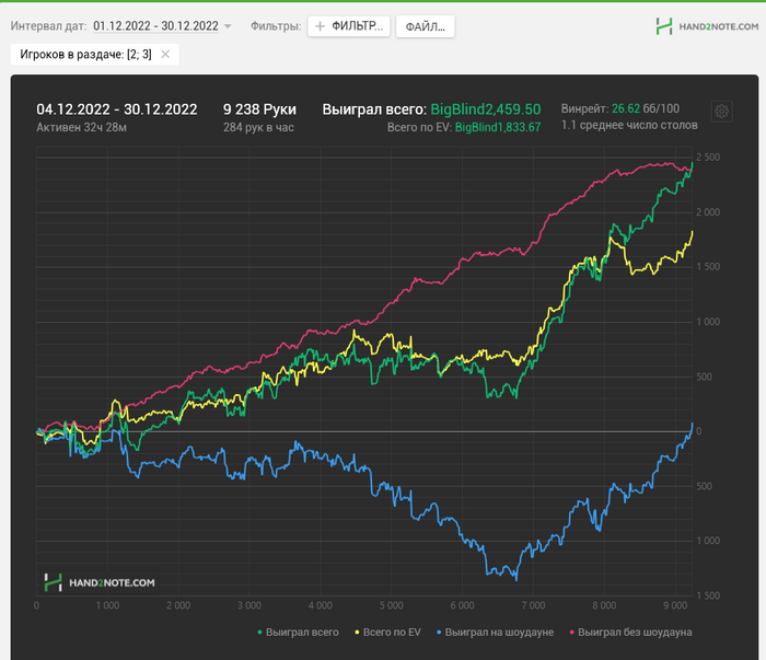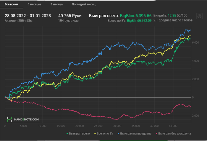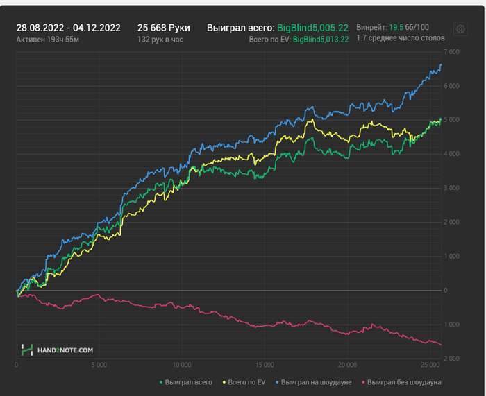 Все на Гт хвалятся винрейтами, у меня до недавнего была проблема - жесткий разрыв ранней стадии 27ев/бб, и нулевые винрейты в лейтах, из-за чего были проблемы со стеком <30 бб в стадии пару столов. Немного подправив все это дело, результат будет чуть выше среднего по больнице.