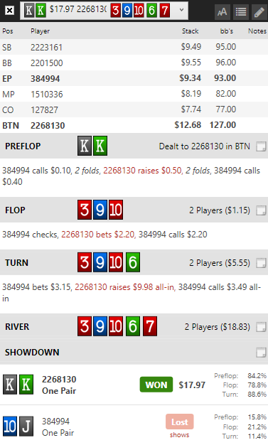 На нл50 удалось запрыгнуть за пару столов, на которые впоследствии выстроилась очередь. Стоп-лосс на верхнем лимите (нл50) 1БИ очень быстро был достигнут - уважаемый все-таки наловил своего короля в 4бет поте....бывает... В довесок к этому на нл20 выставился bb vs sb QQ<AKo. Дефолт. Бывает.