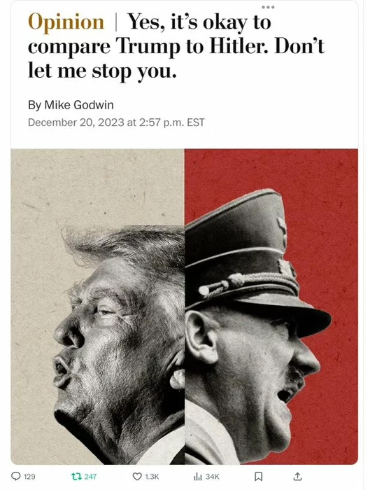 (Тем не менее, забавно, что в наше время мало кто вообще хоть как-то знаком непосредственно с "Гитлером" (особенно рядовой американский избиратель). "Гитлер" – это эдакий "мем-указатель" на точку лингвистического пространства, в которой собрано всё хуевое, чем НЕ должен обладать "нормальный руководитель".)